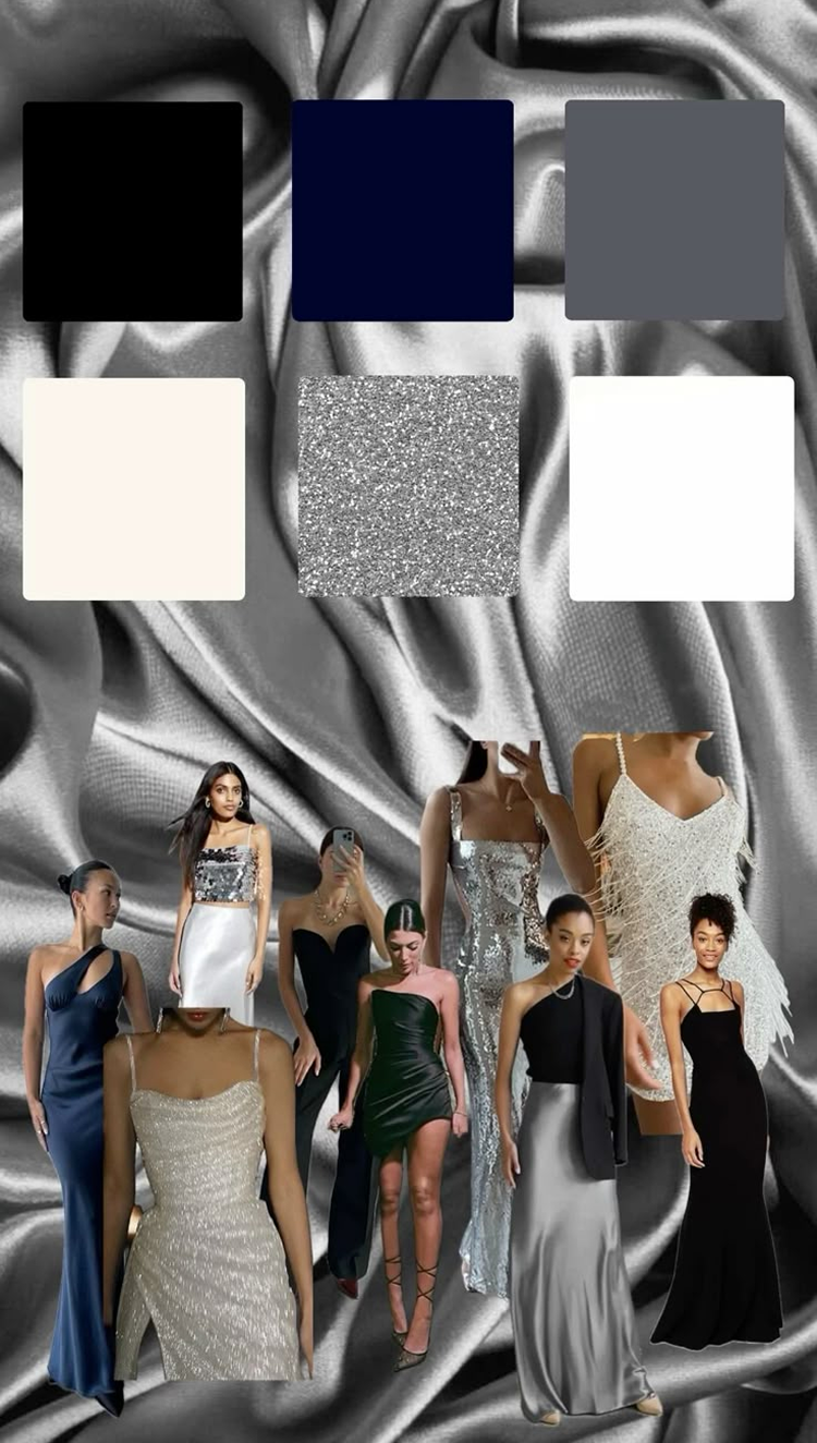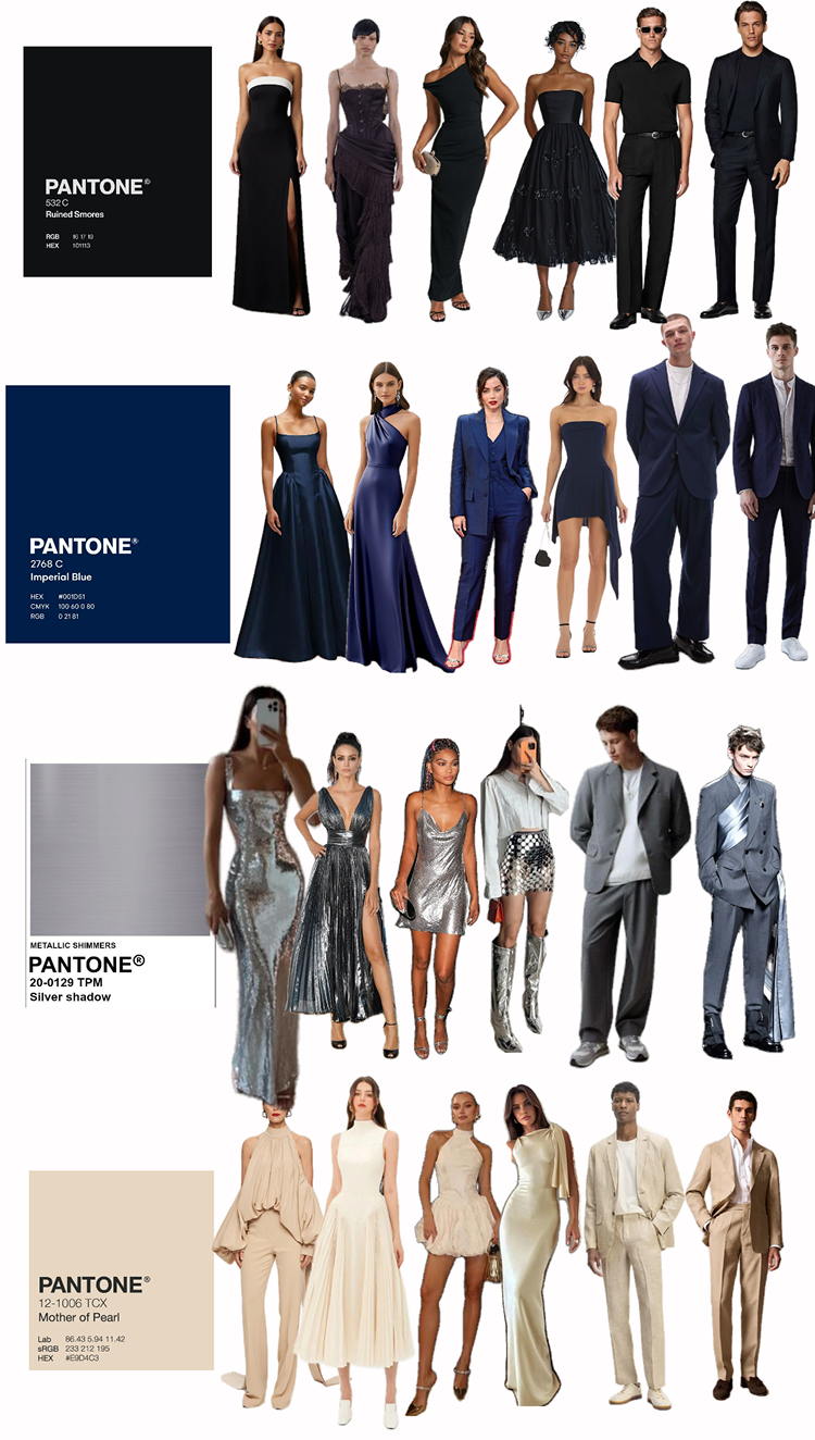 Основная палитра: чёрный, молочный, шоколадный, сливочный, тёмно-синий, бордовый. Как сияющее дополнение — серебристый цвет в образах.